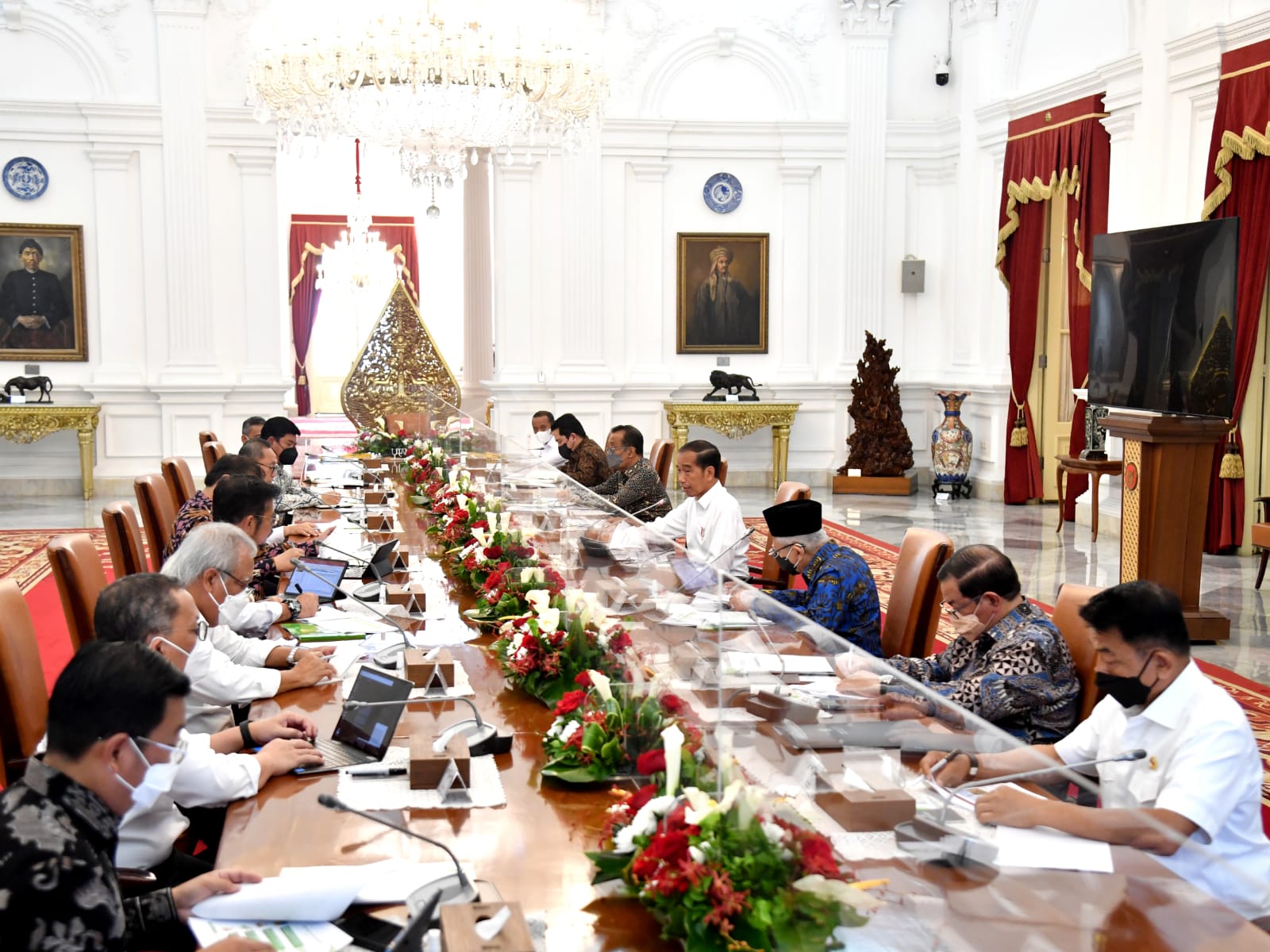 Jakarta – Presiden Joko Widodo memimpin rapat bersama jajarannya untuk membahas tata kelola dan peningkatan produktivitas kedelai di Istana Merdeka, Jakarta, pada Senin, 19 September 2022.