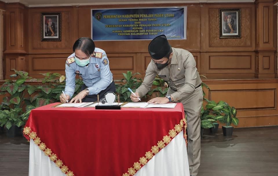 PENAJAM, lintasraya.com – Bupati Penajam Paser Utara (PPU) Abdul Gafur Mas’ud (AGM) menandatangani serah terima hibah tanah Pemerintah Kabupaten PPU kepada Kantor Wilayah Kementerian Hukum dan HAM (Kanwil Kemenkumham) Republik Indonesia (RI) Provinsi Kalimantan Timur (Kaltim), dengan luas 49.520 M2 senilai 10.355.015.607 rupiah. Yang akan dipergunakan untuk lokasi Lembaga Permasyarakatan ( Lapas), digelar di aula lantai I Kantor Bupati PPU, Selasa (13/07/2021).