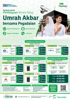 Pendaftaran Umrah Akbar Pegadaian akan berlangsung hingga 18 Maret 2024 untuk keberangkatan dari Jakarta, 1 April 2024 untuk keberangkatan dari Medan, serta tanggal 5 April 2024 untuk Surabaya dan Makassar, selama kuota masih tersedia. Jadi, jangan lewatkan kesempatan ini! Segera daftarkan diri untuk Umrah Akbar Pegadaian di outlet Pegadaian terdekat dan periksa paketnya melalui link berikut [bit.ly/UMRAHAKBARPGD](https://bit.ly/UMRAHAKBARPGD).