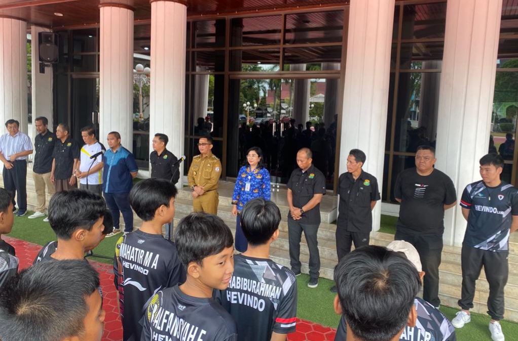Para atlet dilepas oleh Wali Kota Balikpapan Rahmad Mas’ud, didamping Kepala Disporapar Balikpapan Ratih Kusuma dan ketua Pengkot Persatuan Bulu Tangkis Seluruh Indonesia (PBSI) Balikpapan Alwi Al Qadri, di halaman Kantor Walikota, Selasa (17/10/2023).