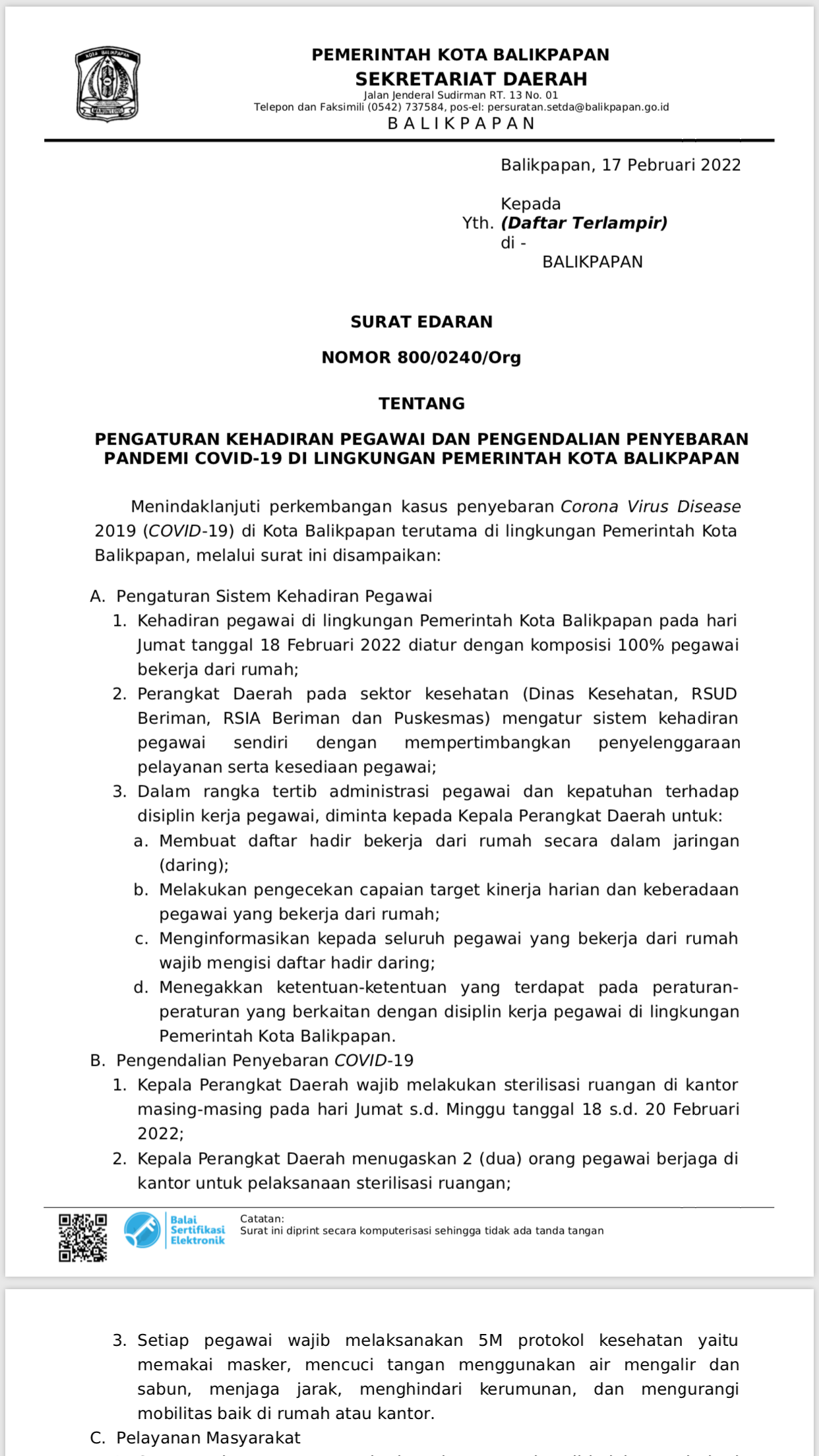 1. Kehadiran pegawai di lingkungan Pemerintah Kota Balikpapan pada hari Jumat tanggal 18 Februari 2022 diatur dengan komposisi 100 persen pegawai bekerja dari rumah; 2. Perangkat Daerah pada sektor kesehatan (Dinas Kesehatan, RSUD Beriman, RSIA Beriman dan Puskesmas) mengatur sistem kehadiran pegawai sendiri dengan mempertimbangkan penyelenggaraan