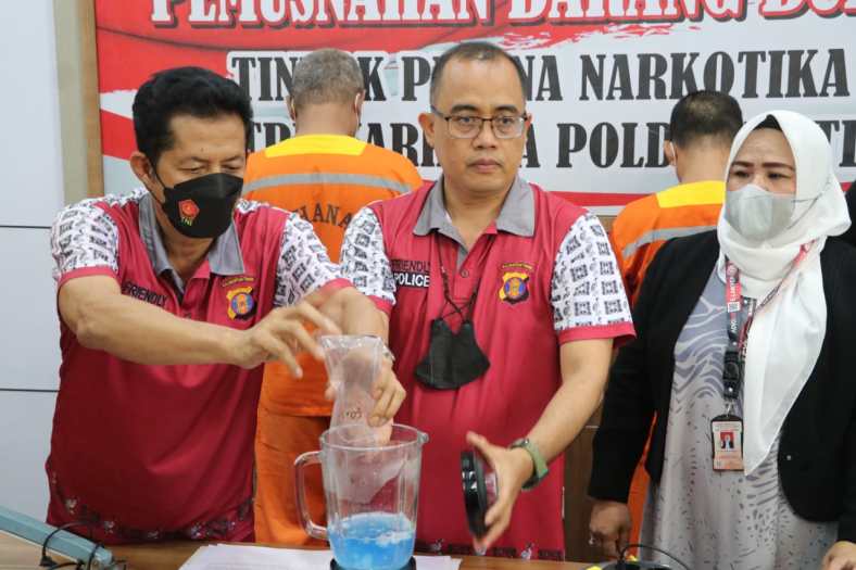 Proses pemusnahan dilakukan dilakukan dengan cara mencampur barang bukti sabu dengan air dan diblender hingga seluruhnya larut. Selanjutnya larutan tersebut dibuang ke saluran pembuangan.