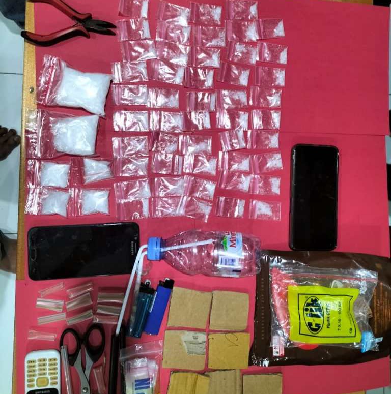 Setelah diselidiki, diamankan seseorang yang mengaku bernama JDA. Saat dilakukan penggeledahan, ditemukan barang bukti sabu-sabu sebanyak dua bungkus besar, eempat bungkus sedang dan 49 poket kecil di dalam tas