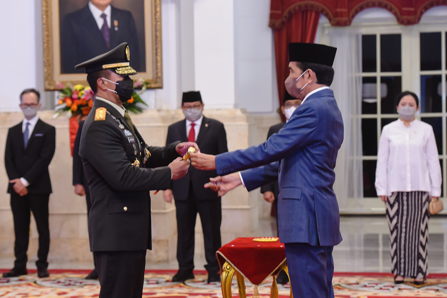 Presiden Jokowi menyerahkan tongkat komando Panglima TNI kepada Jenderal Andika Perkasa, Rabu (17/11/2021), di Istana Negara, Jakarta. (Foto: Humas Setkab/Agung)