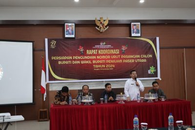 LINTASRAYA.COM, PENAJAM – Komisi Pemilihan Umum Daerah (KPUD) Kabupaten Penajam Paser Utara (PPU) menggelar rapat koordinasi persiapan pengundian nomor urut pasangan calon Bupati dan Wakil Bupati pada pilkada tahun 2024, di Hotel Aqilah, Rabu (18/9/2024).